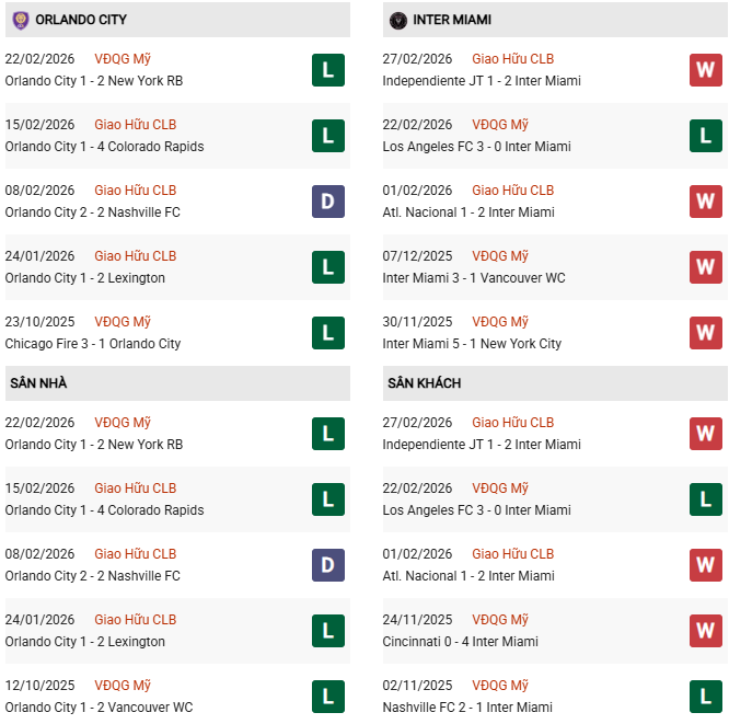 Thống kê phong độ Orlando City vs Inter Miami: