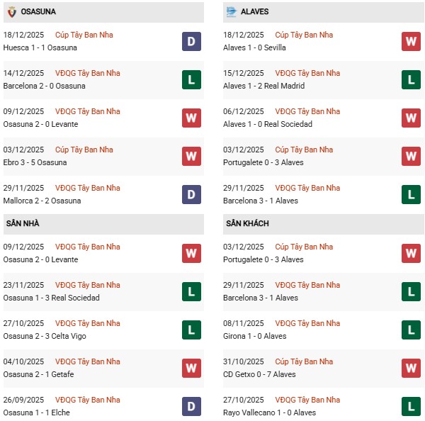 Vòng này, Osasuna được tung hoành tại thánh địa El Sadar và cũng may trên sân nhà, Los Rojillos vẫn chưa đến mức quá tệ từ đầu La Liga 2025/26 khi cả 4 thắng lợi cùng 13/15 điểm được họ giành tại sào huyệt. Đặc biệt Osasuna chẳng những bất bại mà còn thắng phần lớn (8/11) những màn đụng độ Alaves gần đây ở đấu trường VĐQG Tây Ban Nha.