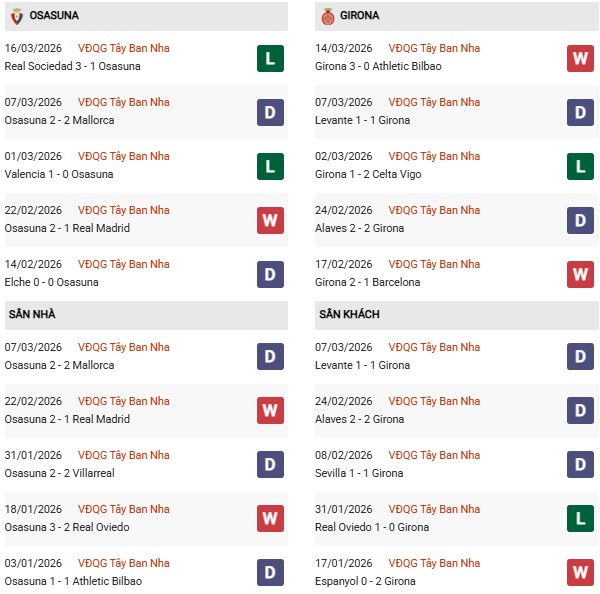 Khoảng 2 tháng trở lại đây, Osasuna chơi không tệ tại giải VĐQG Tây Ban Nha: chỉ thua 2/9 trận (thắng 4) và cả hai thất bại đều xảy ra nơi đất khách. Xét cùng phạm vi 9 vòng tương đương, Girona cũng hai lần lâm vào cảnh trắng tay song thắng ít hơn (3).