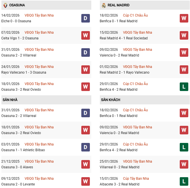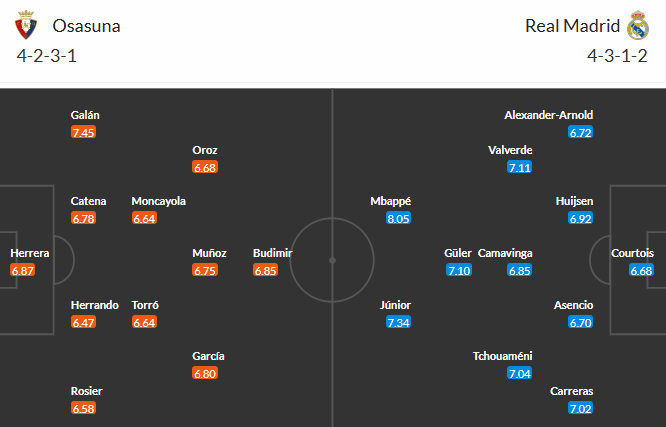 Osasuna gần đây bất bại 6 trận liền. Tuy nhiên, họ không xứng tầm đối thủ của Real Madrid bất chấp có lợi thế sân nhà. Nên nhớ rằng, trong 11 lần gần đây tiếp đón đội bóng đến từ Madrid tại sào huyệt El Sadar, họ không giành nổi chiến thắng nào, cụ thể là thua 7 và hòa 4 trận.