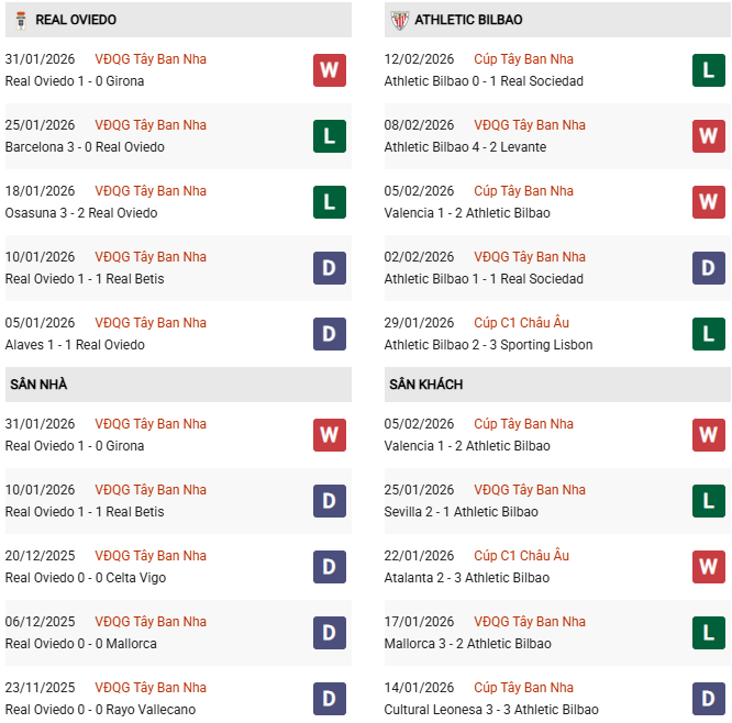 - Oviedo hòa 1, thua 3 trong 4 trận gặp Athletic Bilbao gần đây.