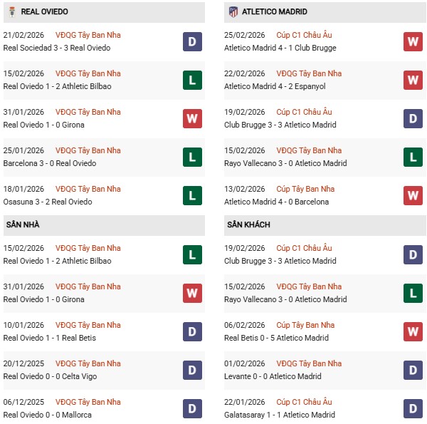 Thống kê phong độ Oviedo vs Atletico Madrid: