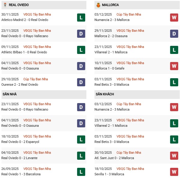 - Oviedo thắng 1, hòa 5, thua 3 trong 9 trận gặp Mallorca gần đây.