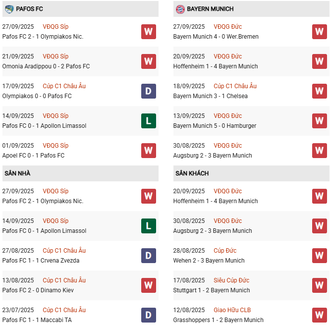 Thành tích đối đầu Pafos vs Bayern Munich: