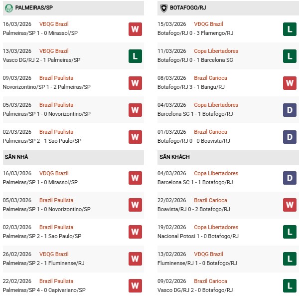 - Trên sân nhà, Palmeiras thắng 4, thua 2 trước Botafogo.
