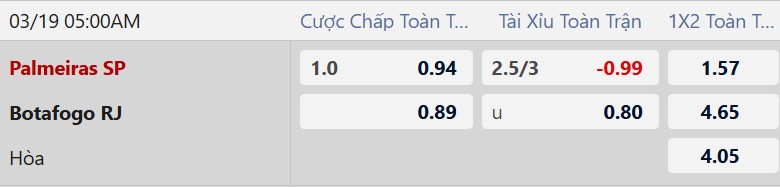Thông tin tỷ lệ bóng đá Palmeiras vs Botafogo: