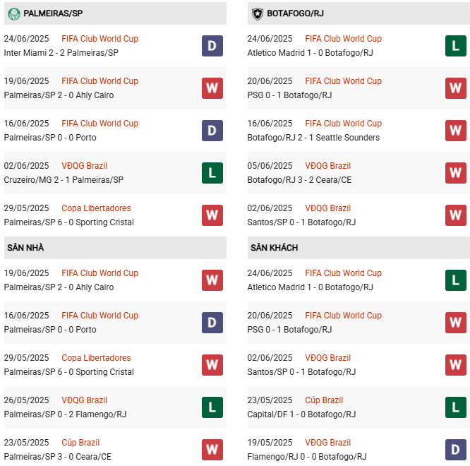 Thành tích đối đầu Palmeiras vs Botafogo: