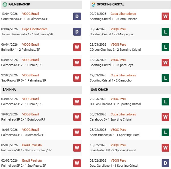 Thống kê phong độ Palmeiras vs Sporting Cristal:
