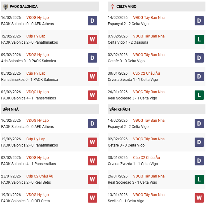 Thống kê phong độ PAOK vs Celta Vigo: