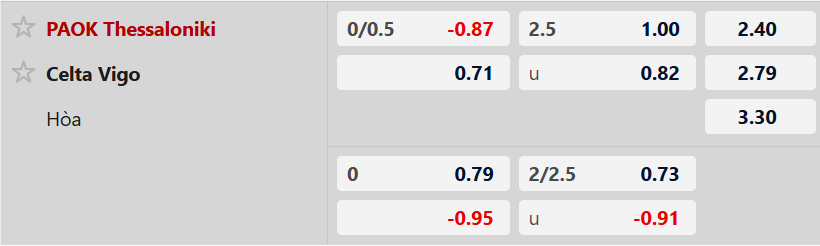 Thông tin tỷ lệ kèo PAOK vs Celta Vigo:
