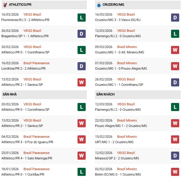 Phong độ gần đây của Cruzeiro cũng thiếu ổn định. Trong 5 trận gần nhất trên mọi đấu trường, họ thắng 2, hòa 2 và thua 1. Tuy nhiên, hai chiến thắng đó chủ yếu đến từ các trận đấu tại giải bang, trong khi tại Serie A họ vẫn gặp khá nhiều khó khăn.
