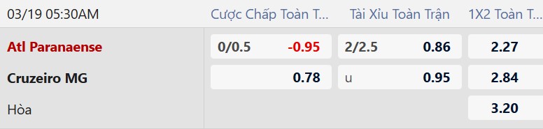 Thông tin tỷ lệ kèo Paranaense vs Cruzeiro: