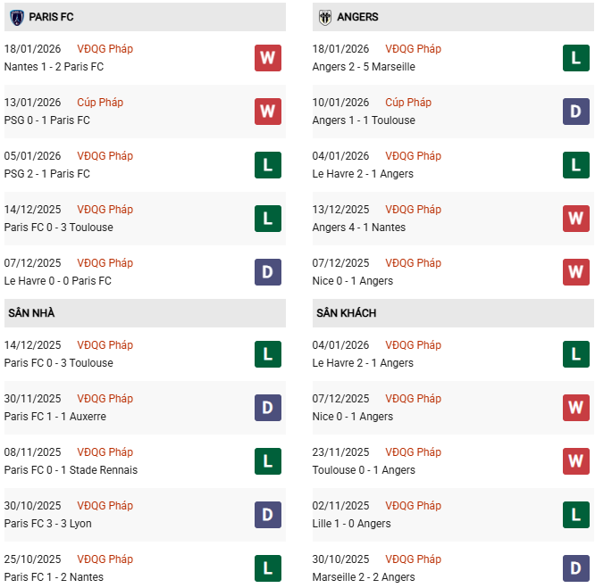 - Trên sân nhà, Paris FC thắng 1, hòa 1 trước Angers.