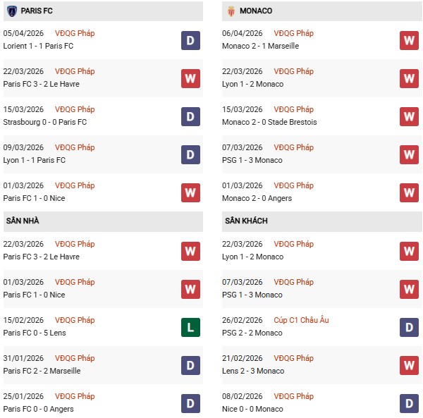 Thống kê phong độ Paris FC vs Monaco: