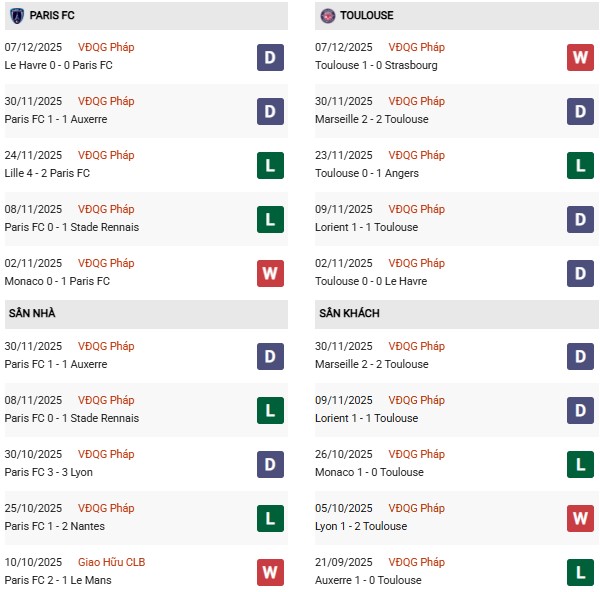- Trên sân nhà, Paris FC thắng 1, hòa 1 trước Toulouse.