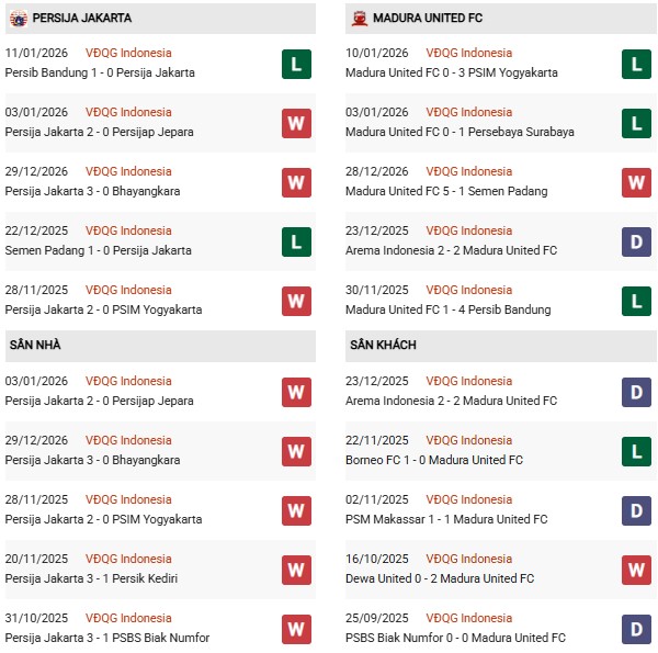 - Trên sân nhà, Persija Jakarta thắng 4, thua 5 trước Madura.