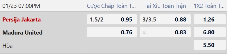 Thông tin tỷ lệ cược Persija Jakarta vs Madura:
