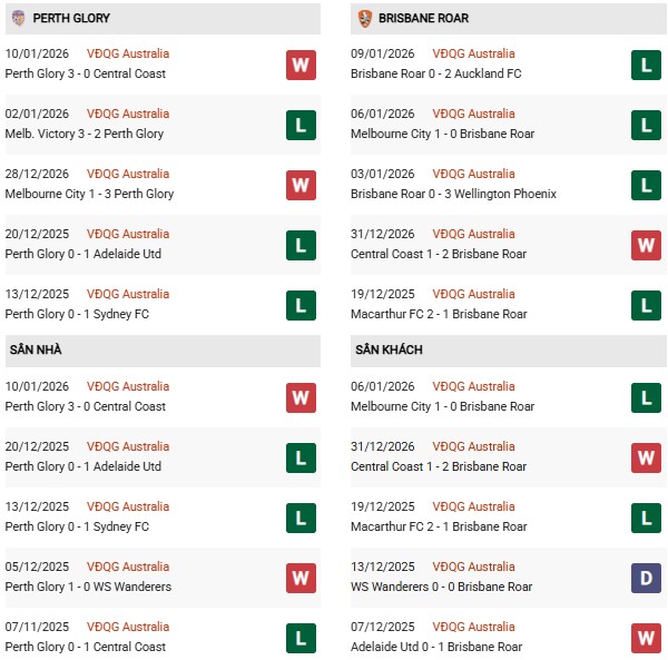 - Perth Glory thắng 5, thua 5 trong 10 trận gặp Brisbane Roar gần đây.