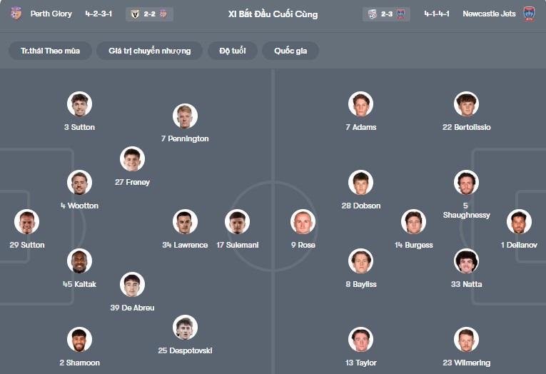 Đội hình dự kiến Perth Glory vs Newcastle Jets: