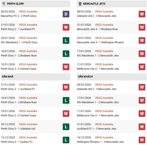 - Trên sân nhà, Perth Glory thắng 4, thua 1 trước Newcastle Jets.