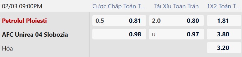 Petrolul được xếp cửa trên với mức chấp 1/2 bàn, chủ yếu nhờ lợi thế sân nhà. Tuy nhiên, với phong độ thiếu ổn định của cả hai đội, đây được dự báo là trận đấu cân bằng và không dễ phân định. Dẫu vậy, Unirea Slobozia thường chơi khá kín kẽ khi xa nhà, trong khi Petrolul cũng gặp khó trong khâu ghi bàn. Do đó, lựa chọn đội chủ nhà ở kèo châu Á mang nhiều rủi ro, còn cửa dưới Unirea Slobozia +1/2 được đánh giá an toàn hơn.