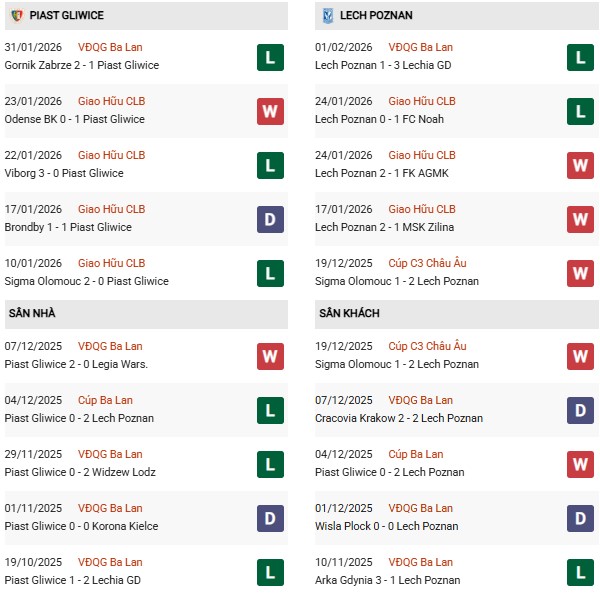 - Trên sân nhà, Piast Gliwice thắng 2, thua 5 trước Lech Poznan.