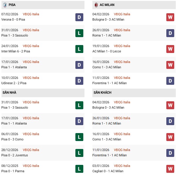 Thành tích đối đầu Pisa vs AC Milan:
