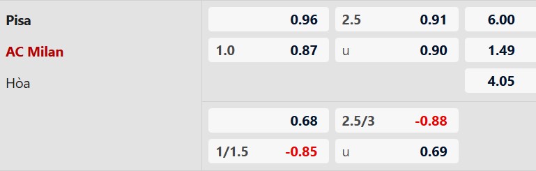 Trước một Pisa giàu nỗ lực nhưng thiếu ổn định, Milan nhiều khả năng sẽ áp đặt được thế trận bằng sự kiên nhẫn và chiến thuật rõ ràng, yếu tố có thể tạo ra khác biệt ở trận đấu này. Vì vậy, có thể đặt niềm tin vào các vị khách với kèo chấp 1 hòa.