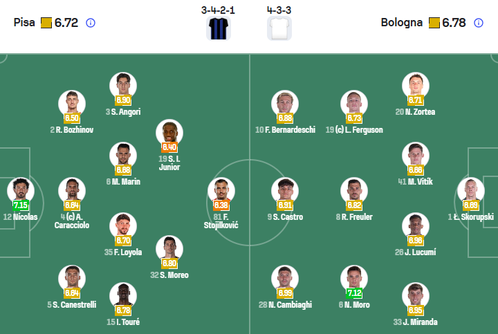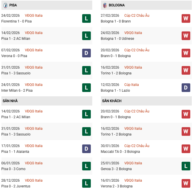 Bên cạnh phong độ tốt, Bologna còn có sự ủng hộ của lịch sử. Theo thống kê, họ bất bại trong 4 cuộc đụng độ gần đây với Pisa, trong đó thắng ở cả 3 trận đấu gần nhất. Đáng chú ý, ở cả 3 trận thắng ấy, Bologna đều giữ sạch lưới.