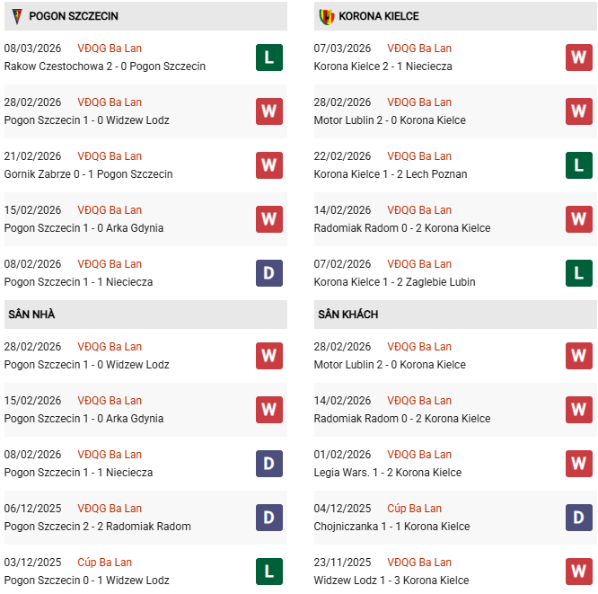 - Pogon Szczecin thắng 4, hòa 4, thua 2 trong 10 trận gặp Korona gần đây.
