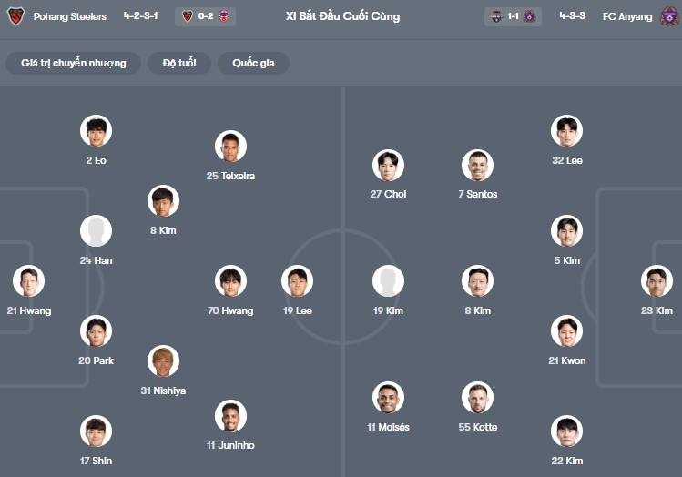 Đội hình dự kiến Pohang Steelers vs Anyang: