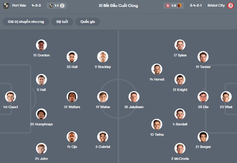 Đội hình dự kiến Port Vale vs Bristol City: