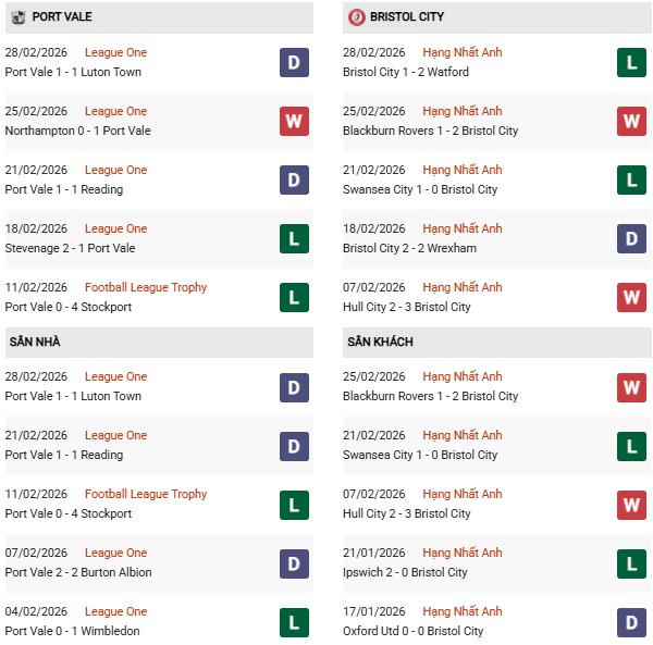 - Trên sân nhà, Port Vale thắng 2, thua 3 trước Bristol City.