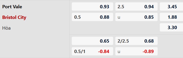 Thông tin tỷ lệ kèo Port Vale vs Bristol City: