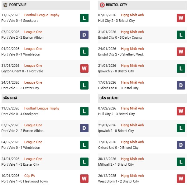 - Trên sân nhà, Port Vale thắng 2, thua 3 trước Bristol City.