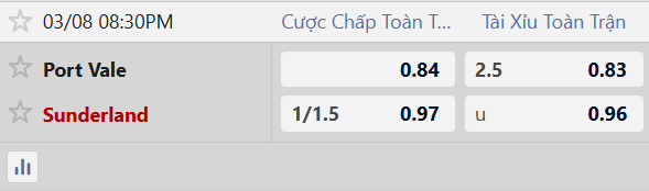 Thông tin tỷ lệ cược Port Vale vs Sunderland: