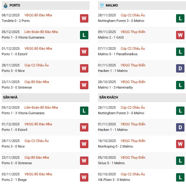 Thống kê phong độ Porto vs Malmo: