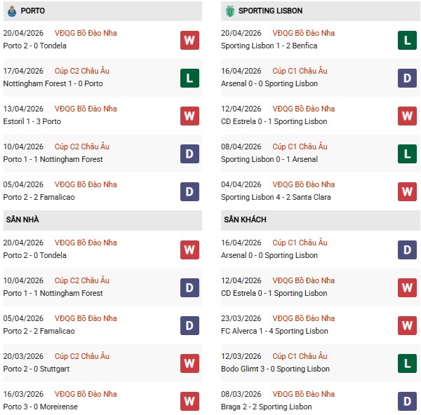 Thống kê phong độ Porto vs Sporting Lisbon: