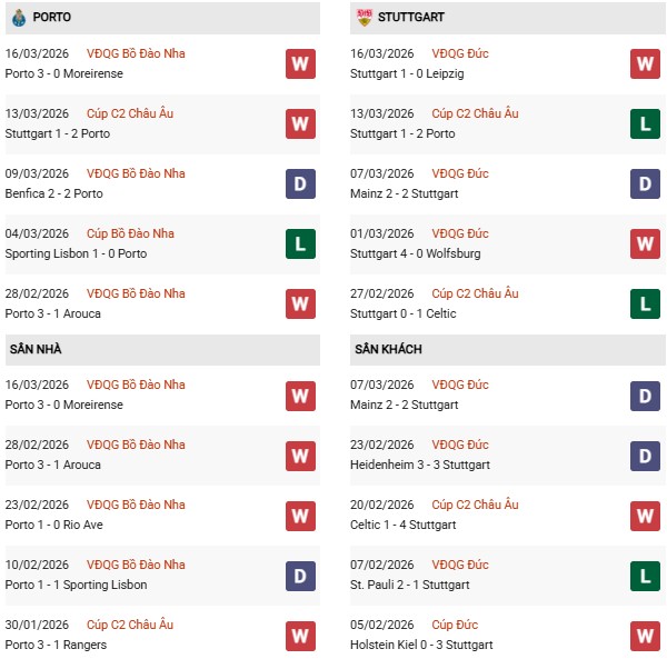 Tại sân nhà, Porto bất bại 11 trận liên tiếp, bao gồm 10 trận thắng và 1 hòa. Với Stuttgart, họ chơi cũng không quá tệ ở sân khách khi thắng 6, hòa 2 và thua 2.