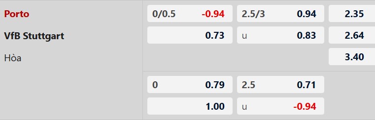 Thông tin tỷ lệ kèo bóng đá Porto vs Stuttgart: