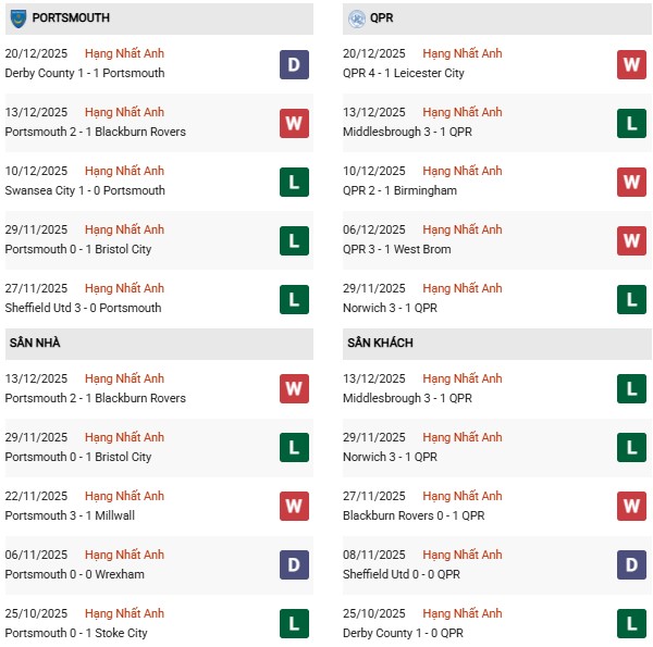 Phong độ 10 trận gần nhất của QPR tương đối tích cực với 5 chiến thắng, 1 trận hòa và 4 thất bại. Tuy nhiên, khi thi đấu xa nhà, họ lại không duy trì được sự ổn định cần thiết, với 4 thắng, 2 hòa và 4 thua trong 10 chuyến làm khách gần đây. QPR thường lựa chọn lối chơi thực dụng trên sân khách, tập trung vào việc kiểm soát thế trận và hạn chế rủi ro, nhất là trước các đối thủ đang khát điểm trụ hạng như Portsmouth.