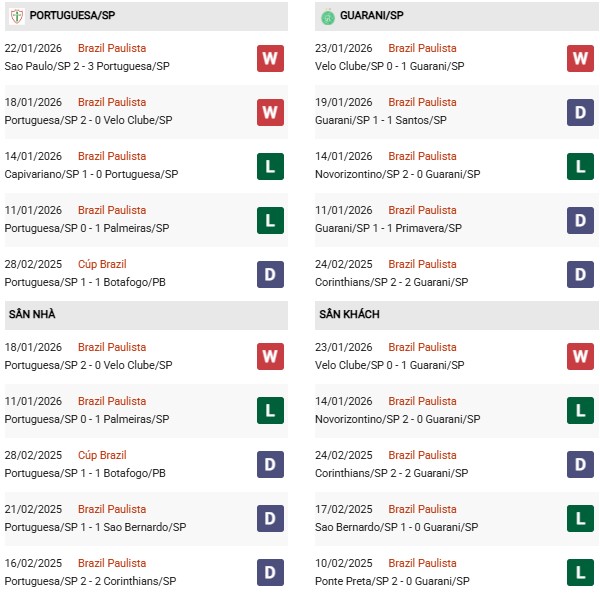 Guarani là đại diện đến từ Hạng 3 Brazil và cũng khởi đầu không tệ tại VĐ bang Paulista năm nay. Sau 4 vòng đấu, đội khách đang xếp hạng 11 với 5 điểm (thắng 1, hòa 2, thua 1), chỉ kém chính Portuguesa đúng 1 điểm trên BXH. Tuy nhiên, phong độ tổng thể của Guarani chưa thực sự ổn định khi thắng 3, hòa 3 và thua 4 trong 10 trận gần nhất trên mọi đấu trường. Trên sân khách, thành tích của Guarani cũng không quá nổi bật với cùng thông số thắng 3, hòa 3 và thua 4 trong 10 trận gần đây, phản ánh sự thiếu bùng nổ cả trong tấn công lẫn khả năng kiểm soát thế trận.