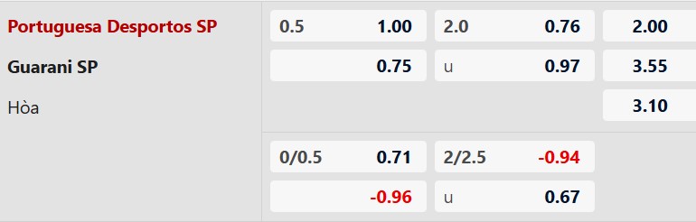 Portuguesa được đánh giá cửa trên với mức chấp 1/2 bàn. Đây là tỷ lệ hợp lý nếu xét đến lợi thế sân nhà cùng phong độ rất cao tại tổ ấm của đội chủ nhà. Trong khi đó, Guarani dù không thua kém quá nhiều về điểm số nhưng lại thiếu sự ổn định, đặc biệt khi phải thi đấu xa nhà. Với bối cảnh chỉ cần một chiến thắng để vươn lên nhóm play-off, Portuguesa nhiều khả năng sẽ nhập cuộc chủ động và hướng tới mục tiêu giành trọn 3 điểm.