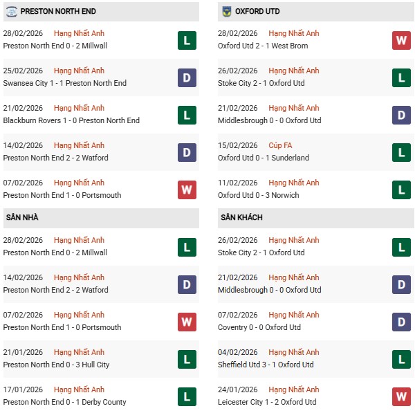 - Preston thắng 1, hòa 1, thua 1 trong 3 trận gặp Oxford United gần đây.