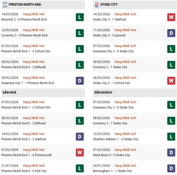 Quan trọng hơn, Stoke bất bại ở cả 5 lần làm khách gần nhất tại sân của Preston trong khuôn khổ hạng Nhất Anh, bao gồm 3 chiến thắng và 2 trận hòa. Họ cũng bất bại ở 4 cuộc đối đầu gần đây với đối thủ này (3 hòa, 1 bại), dù trên sân nhà hay tại sân đối phương.