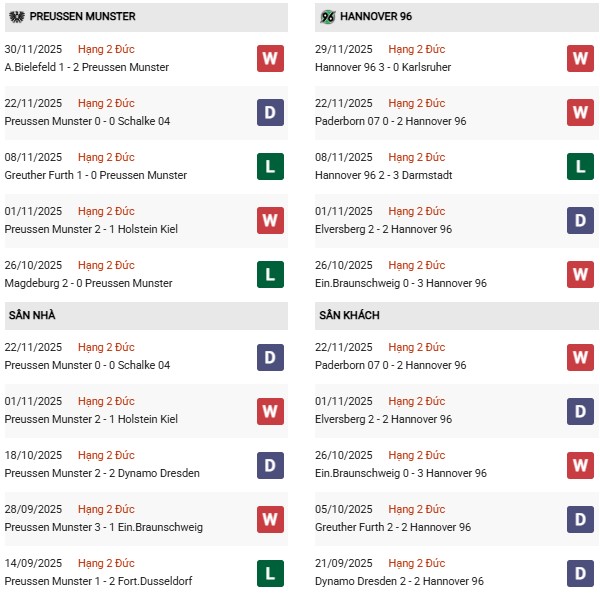 Thành tích đối đầu Preussen Munster vs Hannover:
