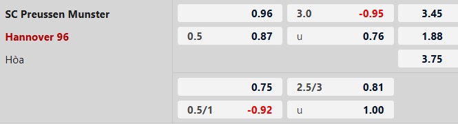 Thông tin tỷ lệ Preussen Munster vs Hannover: