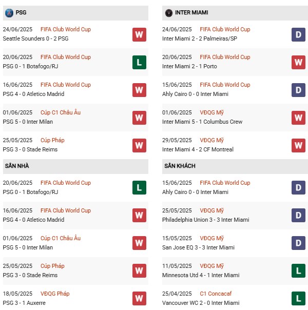 Tổng bàn thắng trong trận: 2 trận đấu mới nhất của PSG có không quá 2 bàn/trận. 2/3 trận đấu mới đây của Inter Miami có không quá 3 bàn/trận.