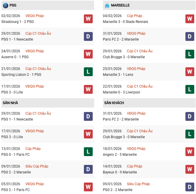 Thống kê phong độ PSG vs Marseille: