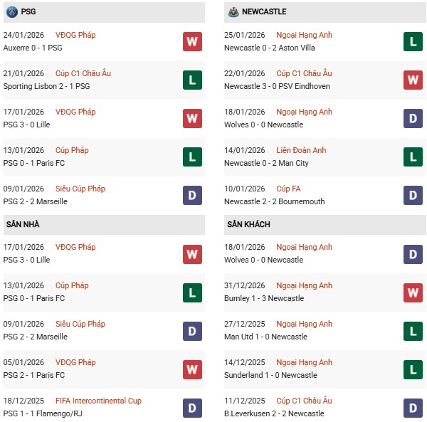 Thống kê phong độ PSG vs Newcastle: